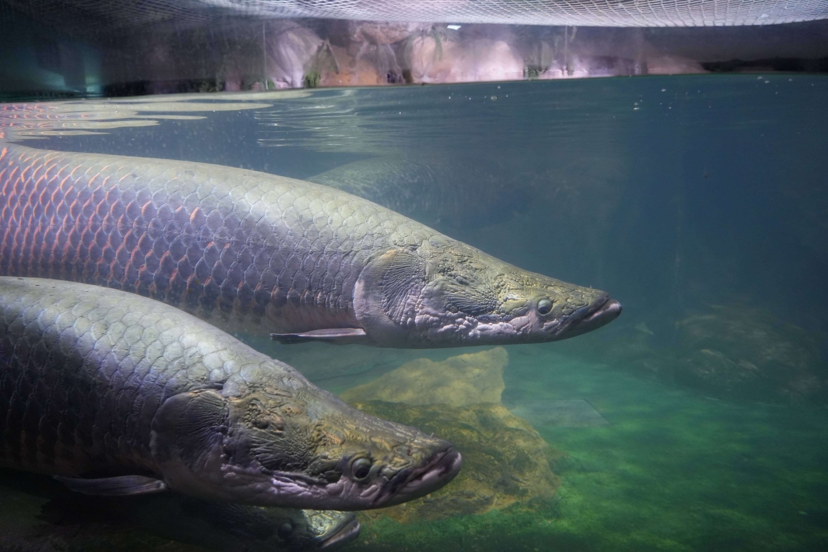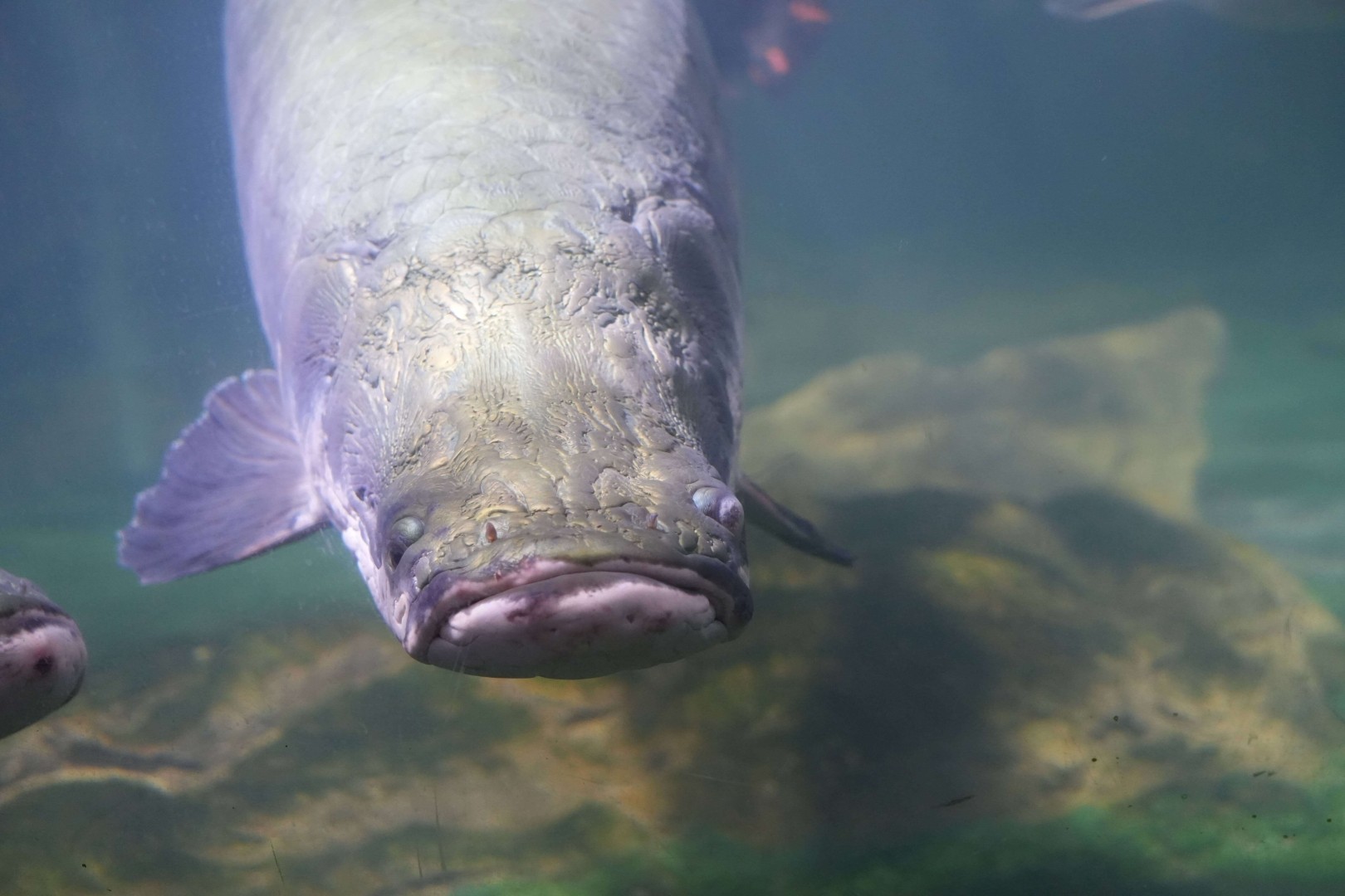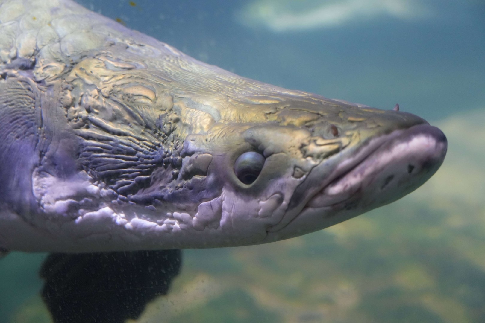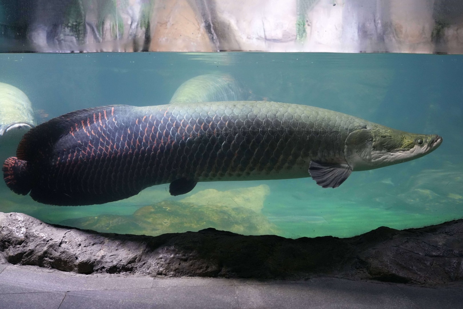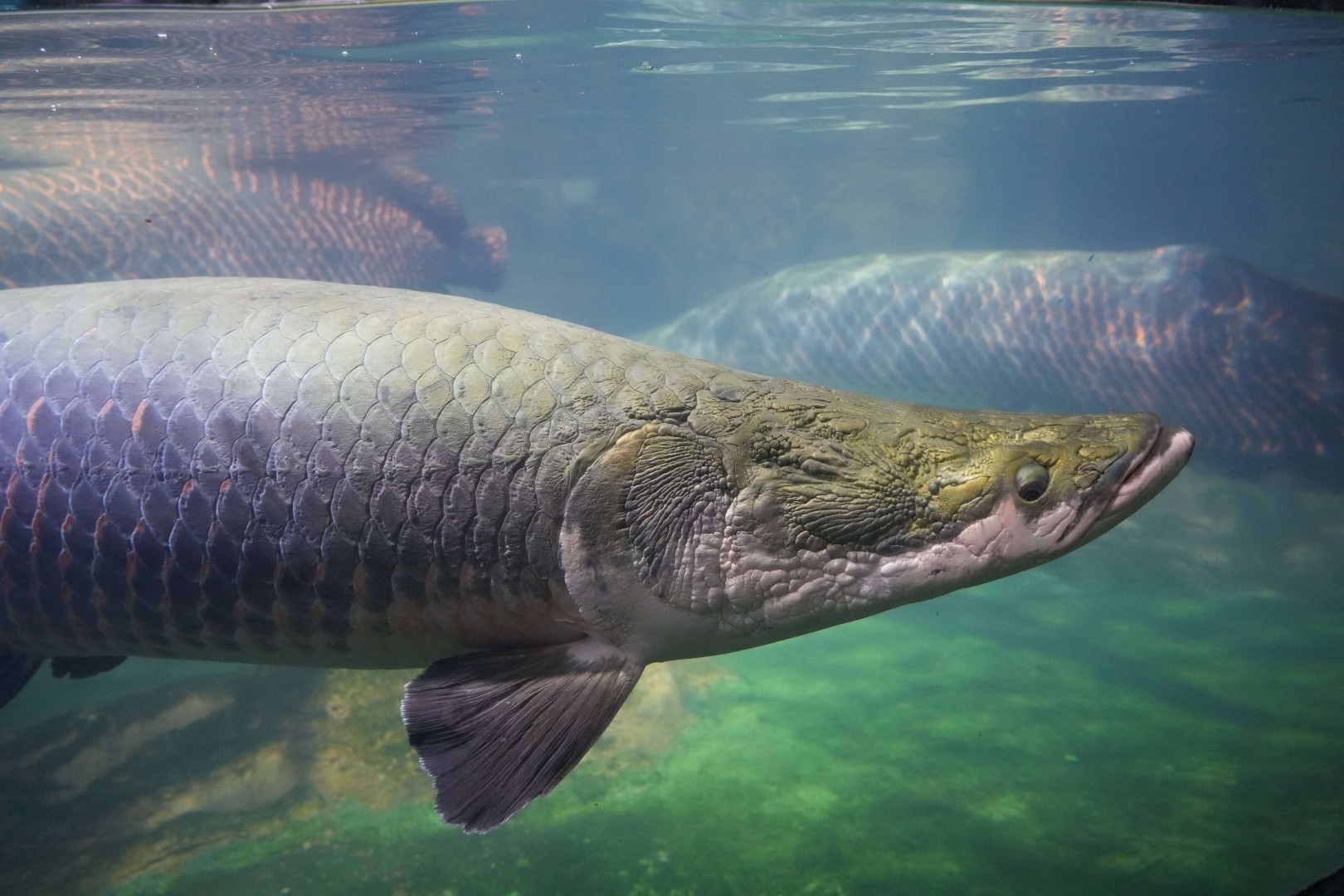 巨骨舌鱼体型巨大,无下颌骨,舌上有坚固发达的牙齿。体灰绿色,背部颜色深,腹部较淡,尾鳍及体后部红色。原产于南美洲亚马逊河流域,是世界上最大的淡水鱼之一。
