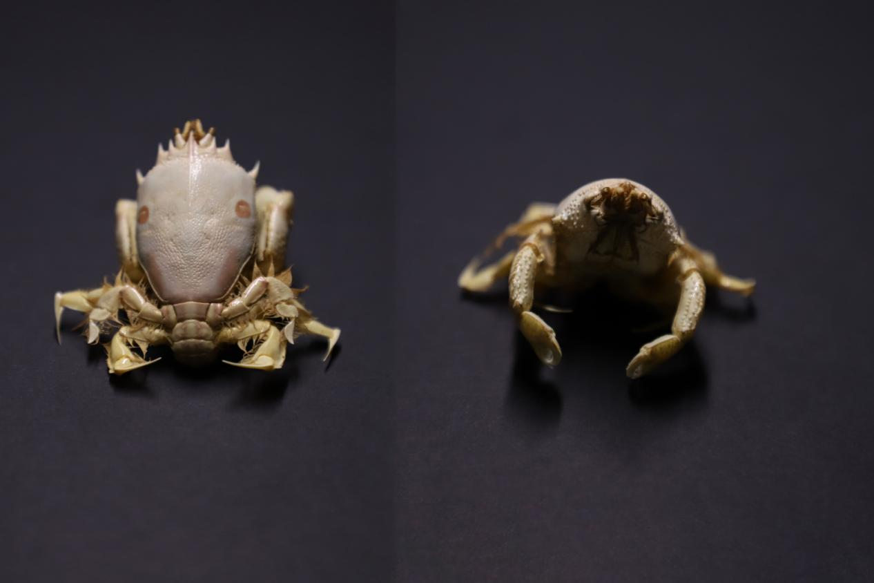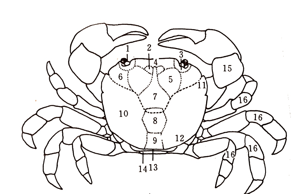 与“虾”字通常被用来描述虾形生物一样,“蟹”字是十足目Decapoda腹胚亚目Pleocyemata下的各种蟹形生物的统称。蟹形生物的共通点是腹部极为退化,平时折叠在身体的腹面。鳃呈叶状或丝状,在产卵后,雌性个体会将卵抱在自己的腹肢上。